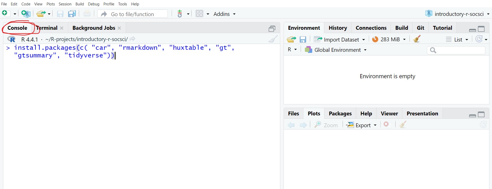4. Tekan Enter. RStudio akan memproses instalasi paket-paket yang dibutuhkan.
