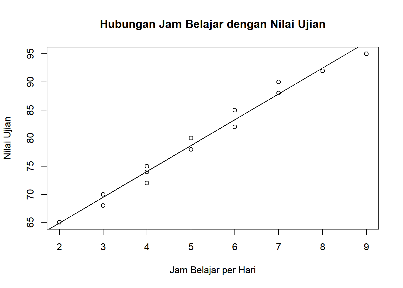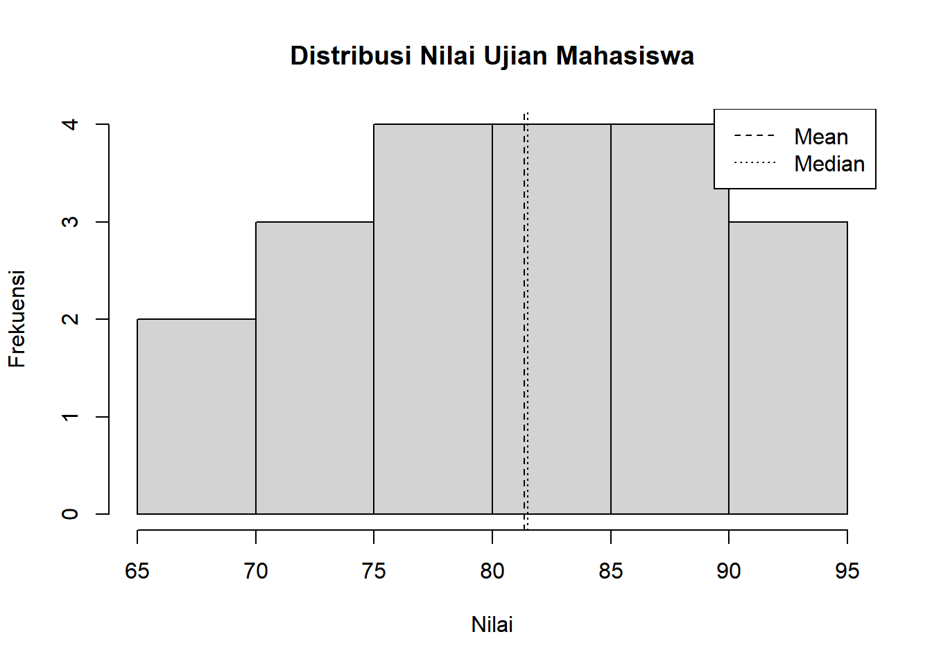 # Histogram sederhanahist(nilai, main ="Distribusi Nilai Ujian Mahasiswa", xlab ="Nilai", ylab ="Frekuensi", breaks =8)# Menambahkan garis mean dan medianabline(v =mean(nilai), lty =2)abline(v =median(nilai), lty =3)legend("topright", legend =c("Mean", "Median"), lty =c(2, 3))