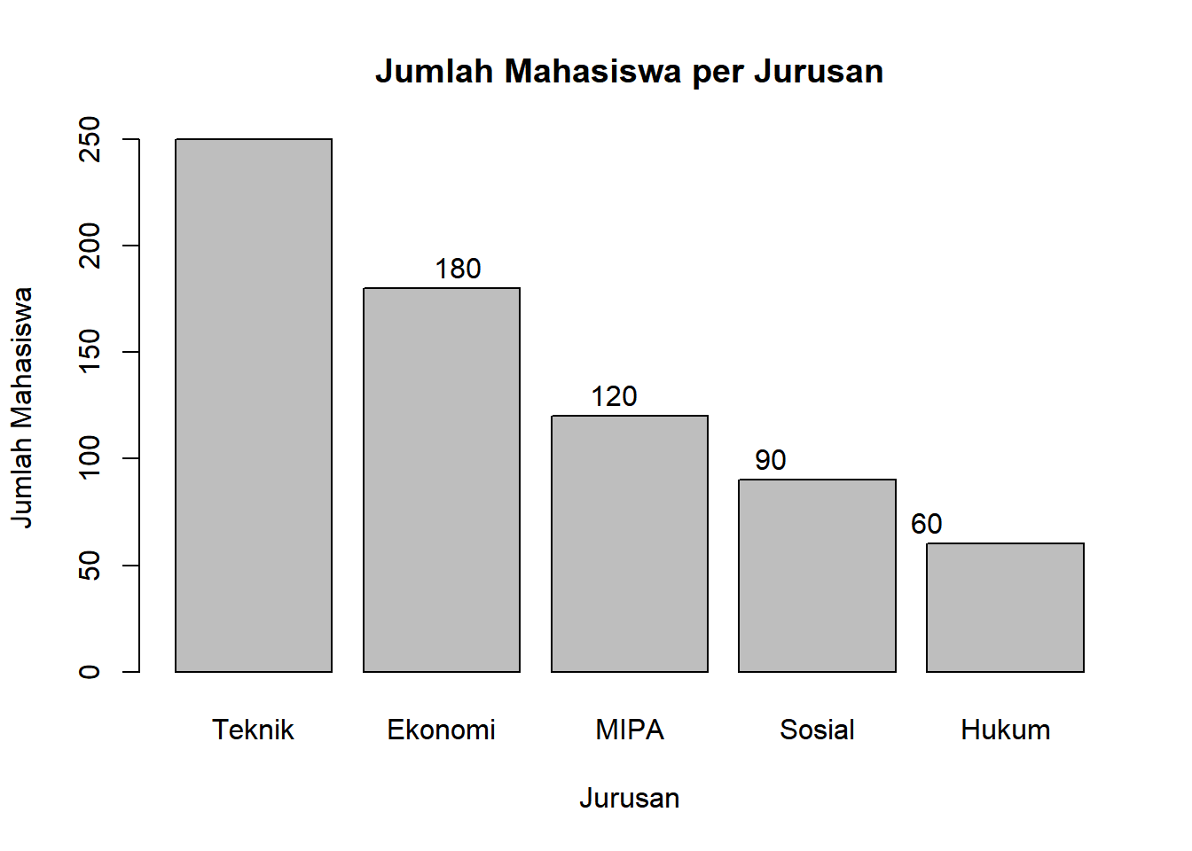 # Data kategorikjurusan<-c("Teknik", "Ekonomi", "MIPA", "Sosial", "Hukum")jumlah_mahasiswa<-c(250, 180, 120, 90, 60)# Bar chart sederhanabarplot(jumlah_mahasiswa, names.arg =jurusan, main ="Jumlah Mahasiswa per Jurusan", xlab ="Jurusan", ylab ="Jumlah Mahasiswa")# Menambahkan nilai di atas batangtext(x =seq_along(jumlah_mahasiswa), y =jumlah_mahasiswa+10, labels =jumlah_mahasiswa)