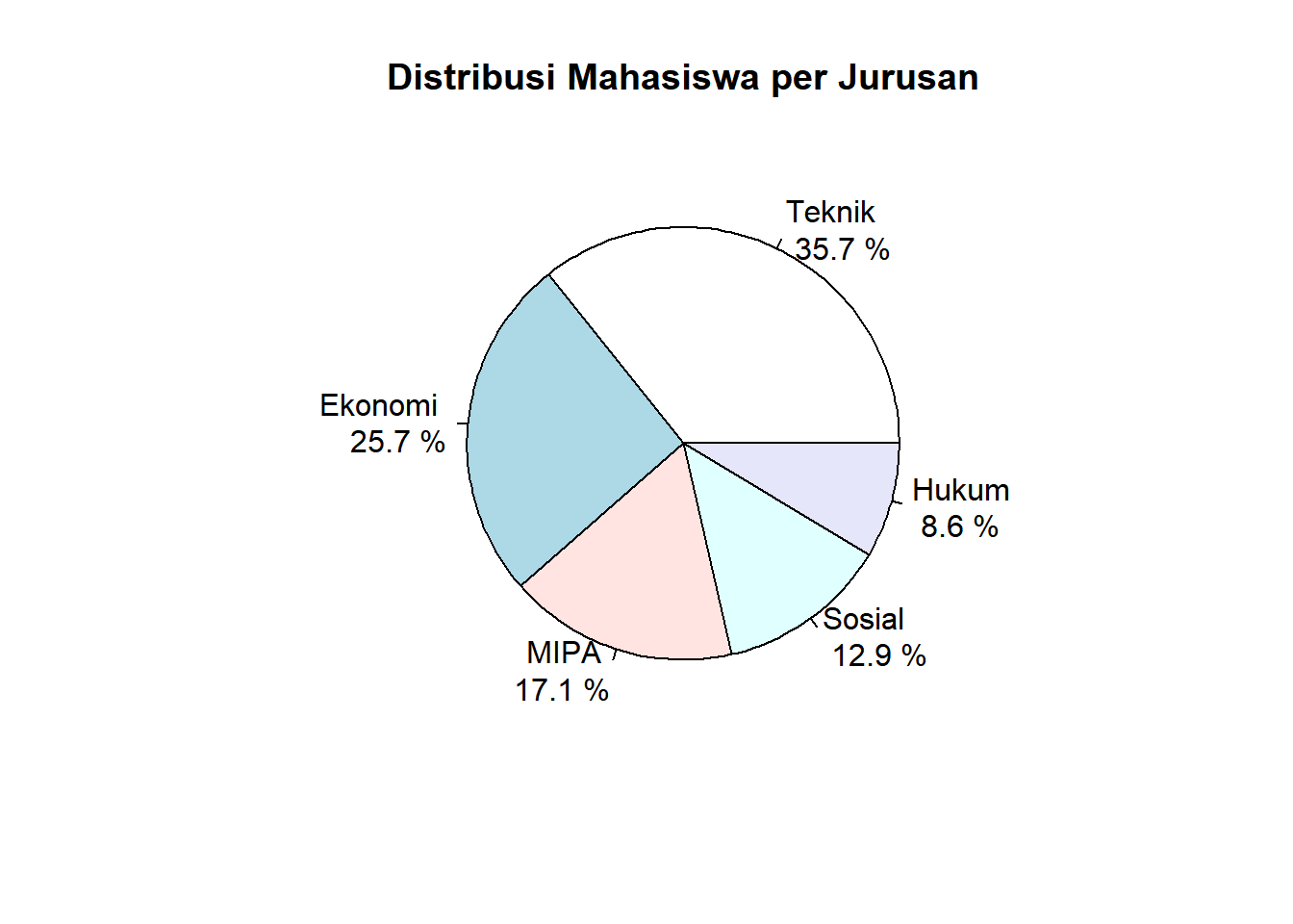 # Pie chart sederhanapie(jumlah_mahasiswa, labels =paste(jurusan, "\n", round(jumlah_mahasiswa/sum(jumlah_mahasiswa)*100, 1), "%"), main ="Distribusi Mahasiswa per Jurusan")