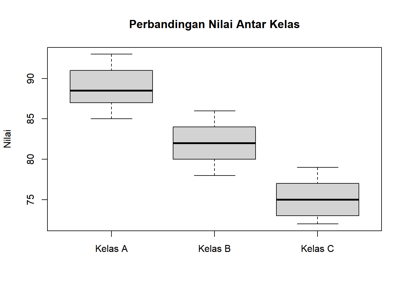 Kelas A: nilai berkisar 78-82 (data mengumpul di sekitar mean)